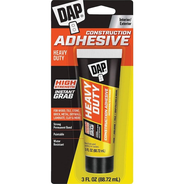 DAP Heavy Duty construction adhesive is a premium high strength adhesive for heavy interior/exterior construction and remodeling projects. Heavy Duty delivers high strength instant grab to hold the toughest vertical projects in place instantly.