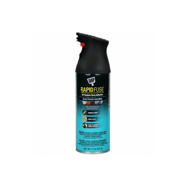 11 oz DAP Rapid Fuse All Purpose Spray Adhesive mist spray formula This is packaged in an 11oz can and utilizes Rustoleum's Ergo Applicator This can be used for the temporary or permanent bonding of lightweight materials including carpeting, foils, many plastics, papers, felt, foams, metals and cardboard