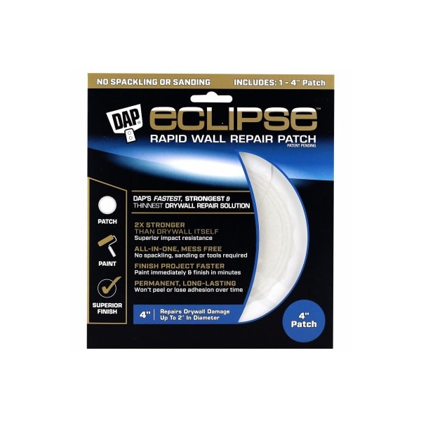 Eclipse 4 Rapid Wall Repair Patch is a unique and innovative drywall repair solution that is perfect for completing permanent repairs on damaged walls and ceilings No more waiting for spackling to dry or messy sanding DAP Eclipse allows you to patch drywall damage and paint immediately, allowing you to finish your project faster This allinone, mess free solution not only provides a permanent, longlasting repair but also superior impact resistance for areas that may see reoccurring impact, such as behind a door