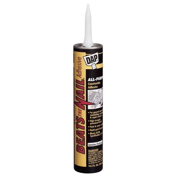 Construction Adhesive, Adhesive Color Gray, Application Method Dispensing Gun, Chemical Base Synthetic Rubber, Container Size 28 fl oz, Container Type Cartridge, Features Bonds Common Building Materials, Easy to Gun, Heat Resistant, High Strength, Permanent Bond, Interior/Exterior Interior/Exterior, Working Time 10 min, VOC Content Weight Percentage 25.1 Percent, Water Resistance Water-Resistant, Standards ANSI Z88.2, OSHA 29 CFR 1910.134, Low Odor No