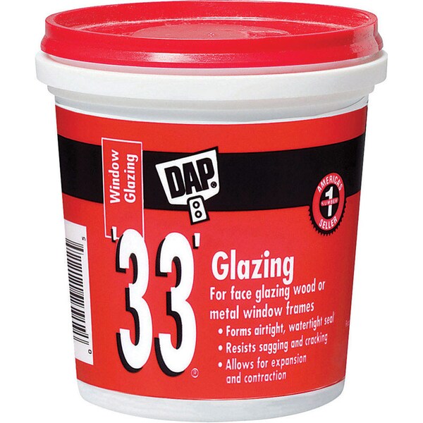 Dap '33' glazing is a ready-to-use glazing compound that may be used for face glazing wood or metal sash. Its knife-grade consistency allows for smooth, easy applications and sticks tightly to glass and sash while resisting sagging, shrinking and cracking. This product is designed for both interior and exterior use.