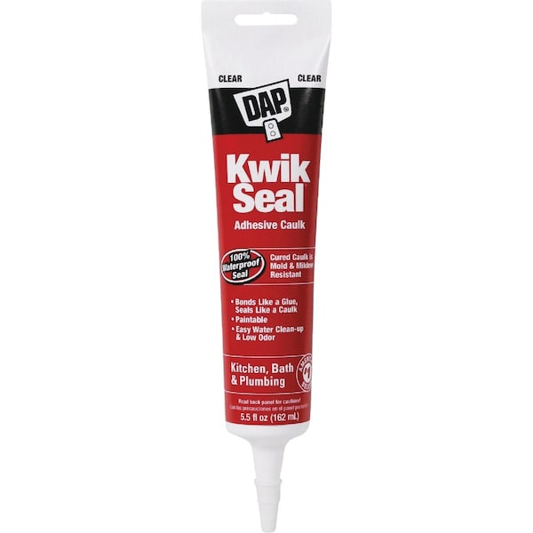 Dap Kwik Kitchen & Bath Adhesive Caulk is an easy-to-use adhesive caulk that bonds like a glue and seals like a caulk. Provides 100% waterproof seal around tubs sinks showers countertops and fixtures. Can be used to repair loose tiles and fixtures. Tools easily and is tack free in 15 minutes. Paintable low in odor and cleans up easily with water. Interior use. Coverage: 5.5 Oz. - 30 LFT at a 3/16 In. bead. 10.1 Oz. - 55 LFT at a 3/16 In. bead.