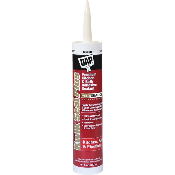 DAP KWIK SEAL PLUS Kitchen & Bath Siliconized Adhesive Sealant is specially formulated siliconized latex that provides maximum adhesion and flexibility for a watertight seal. It contains MoldGuard Antimicrobial Product Protection to fight the growth of stain and odor-causing bacteria mold and mildew on the sealant.