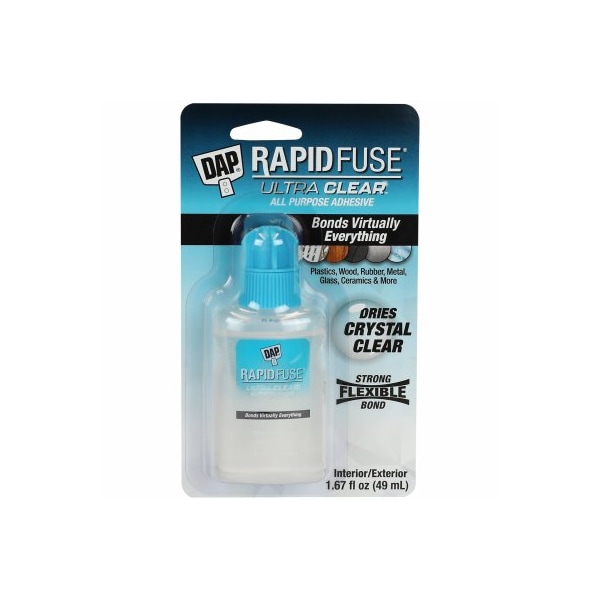 RapidFuse, 17 oz Ultra Clear All Purpose Adhesive is a hybrid adhesive that creates a crystal clear bond for the clearest and cleanest results on all your projects and household repairs RapidFuse Ultra Clear bonds virtually everything with a strong, flexible and durable bond that will not yellow as it ages Ideal for bonding clear or translucent materials This easytouse hybrid polyurethane formula is nonskin bonding, won't foam or expand, and sets in less than 30 minutes It forms a waterresistant bond that is perfect for indoor or outdoor use and won't grow brittle over time resulting in longlasting durability When the look of your project or repair really matters, choose RapidFuse Ultra Clear for a bond that is clearly better