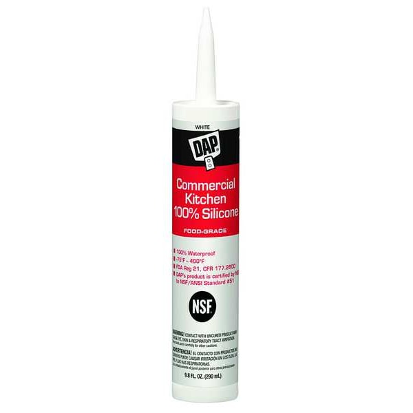 Silicone Sealant, Color White, Application Kitchen and Bath, Container Size 10 oz, Container Type Cartridge, Resistance Properties Waterproof, Weather Resistant, Sealant Properties Flexible, Standards FDA 21 CFR 177.2600, NSF/ANSI 51, Elongation Not Applicable, Full Cure Time 1 day, Maximum Performance Temperature 400 Degrees F, Minimum Performance Temperature -40 Degrees F, Working Time 5 min, For Use On Surface Material Ceramic, Fiberglass, Glass, Metal, Plastic, Porcelain, Rubber, Wood