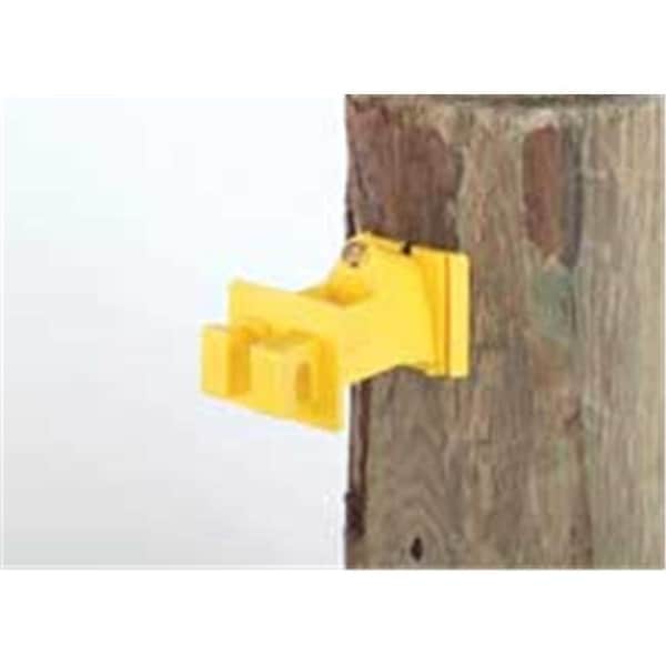 Insulators for wood posts.Rests on 3/4 nail surface and extends wire 2.5 from post.Flexible base fits round or flat sided post.Molded of high density polyethylene with uv inhibitors for all weather durability.Yellow polyethylene with uv inhibitors.Dimensions (L x W x H):1 x 1 x 1