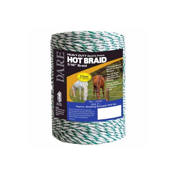 Super conductivity with 9 strands of mixed metal Braided high density polyethylene with UV inhibitors 316 in diameter for high visibility and strength Average breaking strength 500 lbs For long distances of temporary or permanent fence White with green tracer