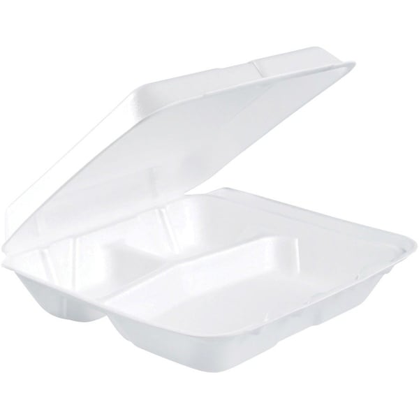Three-compartment foam container with a hinged lid features a secure closure to improve handling and help protect against accidental openings. Insulated design make it great for transporting and storing either hot or cold foods. Nonabsorbent material allows you to safely hold wet foods without soaking through. Plus, it's stackable to save you valuable storage space.