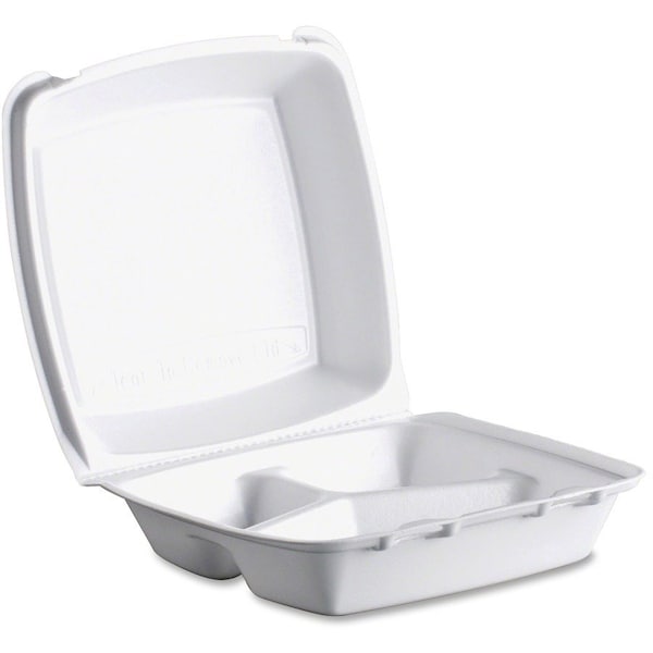 Three-compartment foam container features a secure closure to improve handling and help protect against accidental openings. High insulation qualities make it great for transporting and storing both hot and cold foods. Hinged lid is perforated to be easily removed for a less cluttered dining experience and an extra plate for sharing meals. Nonabsorbent material allows you to safely hold wet foods without soaking through. Plus, it's stackable to save you valuable storage space.