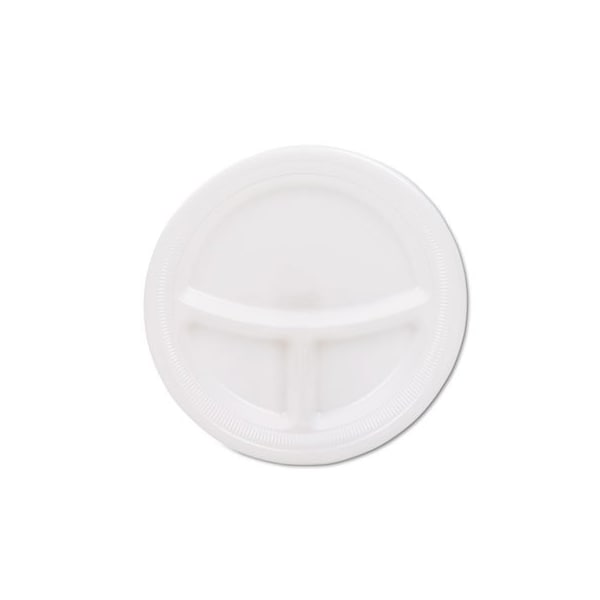 Cut-resistant dinnerware is made with a single-laminated surface that creates excellent insulation. Ideal for any office kitchen or cafeteria. Three-Compartment Plate. Dinnerware Type: Plate; Materials: Foam; Shape: Round; Diameter: 9in.