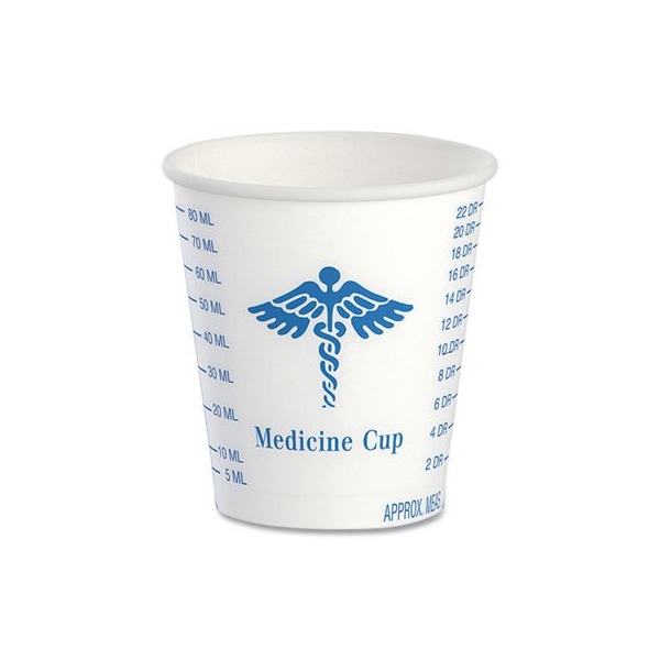 These medical cups are fully waxed with a rolled rim, which helps keep contents secure. The graduation marks make it easy to identify the volume of the contents. Perfect for dispensing medication or serving water. For use in doctor and dental offices. Cup Type: Hot/Cold; Capacity Volume: 3 oz; Materials: Paper; Colors: White/Blue.