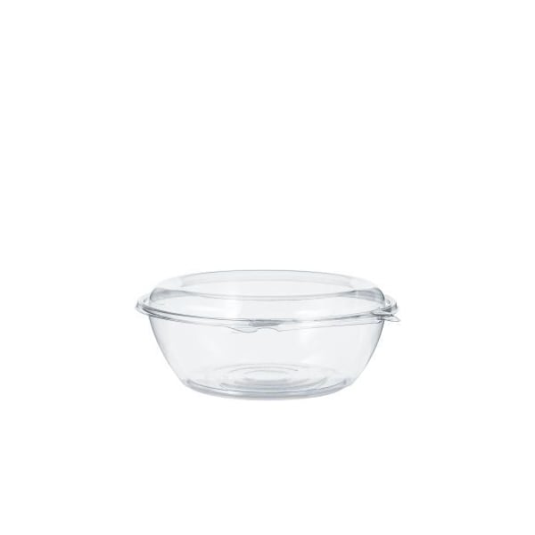 The SafeSeal Bowl with Dome Lid is a clear 48 oz food container designed for secure storage and transport. It features a tamper-evident and tamper-resistant design with three key safety elements, including an audible snap lid lock and a visible seal that alerts to any tampering. The hinged dome lid allows for easy one-step closure and accommodates extra portions or toppings. The leak-resistant seal helps maintain freshness and prevents spills. Ideal for packaging fruit, salads, or baked goods, this bowl streamlines service while ensuring food safety and freshness, available in a pack of 100.