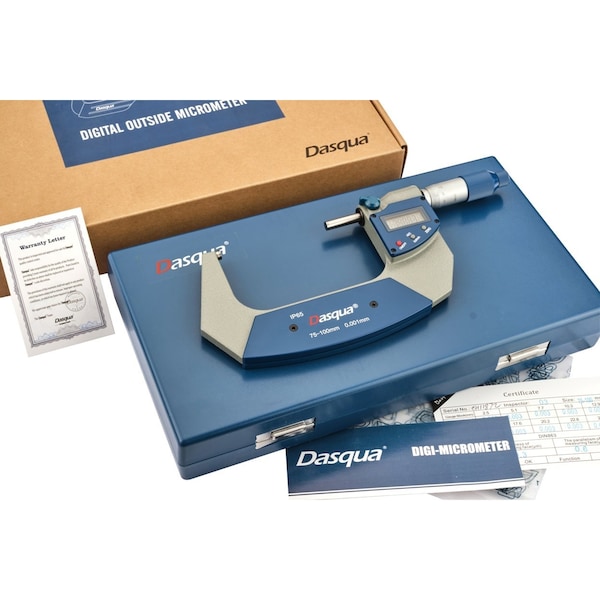 Dasqua 75-100mm/3-4" IP65 Digital Outside Micrometer ~ Resolution is 0.001mm/0.00005". ~ Accuracy is 0.003mm/0.00015". ~ Strictly made in accordance with DIN863. ~ Large, easy-to-read Digital display. ~ Class A in electrostatic discharge. ~ Carbide-tipped anvils. ~ Measuring spindle hardened and ground. ~ IP65 protection, coolant & fluid resistant.