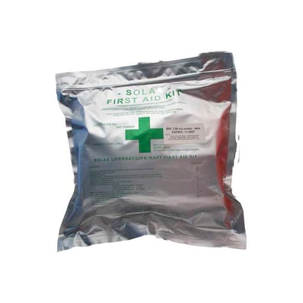 Datrex first aid kit, 1/case - dx0402m first aid kit, solas. This first aid kit is certified to meet the solas requirements for liferafts and lifeboats. Ec approved first aid kit according to solas. Contents are sealed in a waterproof pouch. pouch contains: 1 plastic burn bag liferaft kit 1 bandage - triangular non-calico 90x127cm 1 paracetamol tablets - 500mg (32/pk) 1 antiseptic wipes 1 antiseptic cream - cetrimide (30g/tube) 1 tape - zinc oxide - 2.5cm (3m) 1 plasters - waterproof assorted (20/pk) 1 dressing - surgical absorbent no 08 - medium 1 dressing - surgical absorbent no 09 - large 1 dressing - extra large unmedicated 1 gauze swabs 7.5cm x 7.5cm - sterile (5/pk) 1 scissors b/b - 12.5cm 1 safety pins (medium- 6/pk) 1 dressing - paraffin gauze - 10cm x 10cm (10/pk) 1 booklet - waterproof first aid multi language 1 solas liferaft bags 1 thick clear bag 12.5x16 inch (300mm x 450mm) used in lfb rm