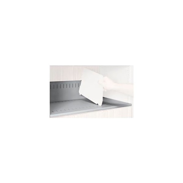shelve are formed of 18 gauge steel with a 5-3/8" high integral back stop. Shelf is slotted on 1" centers to accept file dividers. Shelf is fastened in place with four self-tapping screws and is adjustable on 1/2" centers.