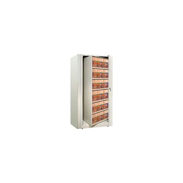 Rotary file cabinet starter unit, letter, 6 shelves, bone white this rotary file saves time, space and money. The innovative design includes a double-sided, rotating shelf unit that houses more than twice the files in less space than a traditional filing system while providing fast and easy access to stored materials. specifications: base: the ez2 base is formed out of 13 gauge steel with 13 gauges steel-formed u-channel reinforcements. These 13 gauge steel channels have a 4" wide x 3-1/2" deep cross-section and run the full length and width of the base. These channels are mig welded to the base forming a rigid structure capable of supporting the weight of the cabinet. At each corner, a welded steel 11 gauge gusset adds strength and rigidity to the base. Four adjustable leveling feet allow the base to be leveled from the top of the base. The base mechanism provides 90 indexing of the rotary file cabinet. The base does not require the use of a foot pedal to index the cabinet. uprights and locks: each ez2 unit has (4) upright posts with dual durometer pvc closing strips. The posts are made from 11 gauge steel and are bolted directly to the unit base with (2) 1/4" - 20 flat head bolts per post. a lock assembly and locking rod is supplied with each unit and is conveniently located on the right front post. All cabinets are random-keyed. Lock bar is formed from 3/8" diameter steel rod for maximum durability. Locks have field removable core for easy key changes. Locks can be installed on both sides of unit. Unit can be locked in the open or closed position. rotary bottom: the ez2 rotary bottom rides on top of the base and is fully supported by 5/8" diameter, hardened steel ball bearings. The letter size unit has a 19-1/4" diameter bearing cage with 22 each, 5/8" diameter ball bearings. The legal size unit has a 24" diameter bearing cage with 44 each 5/8" diameter ball bearings. The rotor bottom pivots on a 3/4" diameter pin and a matin