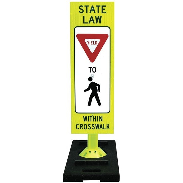 Traffic Sign with Base, MUTCD Sign Grouping Regulatory Control Traffic Signs, Sign Legend Yield To Pedestrian, Sign Legend Style Symbol, Text, Sign Legend Text Color White, Sign Background Color Flourescent Yellow-Green, Sign Header State Law, Sign Header Background Color Flourescent Yellow-Green, Sign Header Text Color Black, Red, Retroreflective Grade Type IV