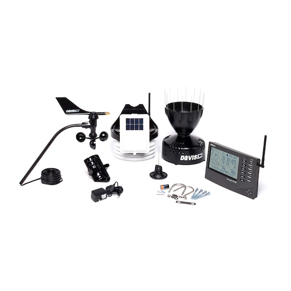 Vantage Pro2 Wireless Weather Station First and only weather station in its class to use frequency hopping spread spectrum radio technology to transmit weather data wirelessly up to 1000' (300 m). Includes Vantage Pro2 console/receiver, standard radiation shield, integrated sensor suite, and mounting hardware. Integrated sensor suite includes rain collector, temperature and humidity sensors, anemometer, 40' (12 m) anemometer cable, and solar panel. Electronic components are housed in a weather-resistant shelter. Sensor suite is solar powered. Electronic components are housed in a weather-resistant shelter. Console may be powered using the included AC-power adapter or with three C batteries (not included). Wireless range is up to 1000' (300 m) outdoors, line of sight. Typical range through walls under most conditions is 200' to 400' (60 to 120 m). Add wireless repeaters for distances up to 1.7 miles (2.7 km).