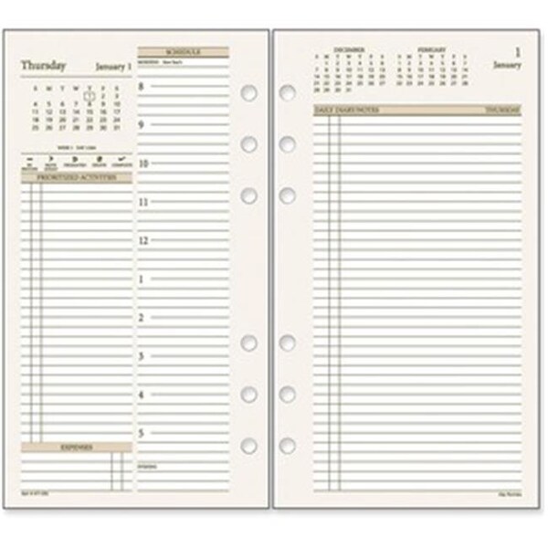PRO Two-Page-Per-Day Planning Pages are designed for use with Day Runner Pro Business System Planners. Dated yearly refill ranges 12 months from January to December. Two-page-per-day spreads feature space for quarter-hourly appointment times from 8 AM to 7 PM, areas for prioritized activities, expense tracking, daily notes and appointments, Julian dates and past, current and future months reference. Planning pages include monthly overview tabs, an event calendar and four-year overview. Printed on quality paper containing 60 percent post-consumer material.