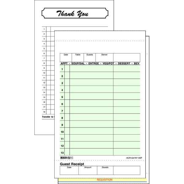 Guest Checks & Receipts, Cover Color Green, Cover Material Paper, Notepad, Length 4 1/4 in, Number of Duplicates 3-Part Carbonless, Carbon Copies Yes, Width 7 1/4 in, Number of Sheets 250, Paper Color Green, Package Quantity 8