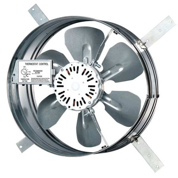 Attic Exhaust Fan, Control Type Thermostat, Blade Material Steel, Exhaust Airflow @ 0.000 in SP 1,140 cfm, Fire Safety Shut-Off No, High-Efficiency Motor No, Housing Material Steel, Includes Humidistat No, Includes Shutter No, Includes Thermostat Yes, Maximum Attic Area 1,630 sq ft, Motor Horsepower 1/16 hp, Mounting Location Gable, Nameplate Voltage 120V AC, Overall Diameter 15 in, Overall Height 8 in, Overall Length 15 in, Overall Width 15 in, Dome Shape Not Applicable