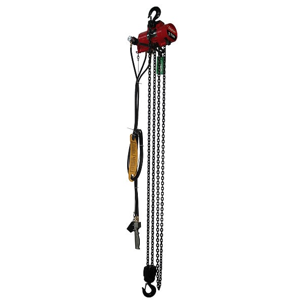 Air Chain Hoist, Mount Type Hook Mounted - No Trolley, Maximum Lifting Capacity 2,000 lb, Fixed Lift Speed Not Applicable, Air Inlet Type NPT, Controls Pendant, For Minimum Beam Flange Width Not Applicable, For Maximum Beam Flange Width Not Applicable, Headroom 18 in, Maximum Air Pressure 100 psi, Maximum Lifting Length 15 ft, Maximum Air Consumption 49 scfm, Programmable Non-Programmable, Air Inlet Gender Female, Air Inlet Size 3/8 in, Body Depth 7 1/2 in, Body Length 12 1/8 in