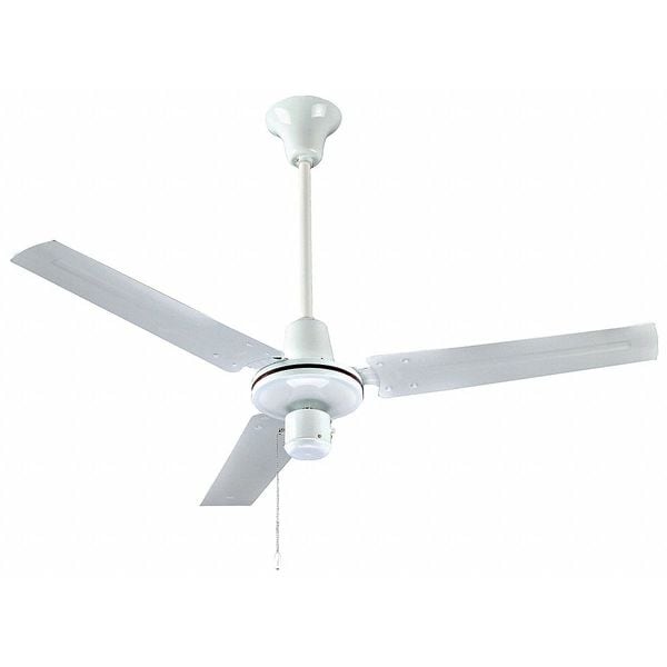 Ceiling Fan, 120V AC Voltage, 75 Fan Watts, Phase 1, 300/200/130 RPM, Max. Mounting Height 8 to 20 ft, Number of Speeds 3, Blade Finish White, Steel, Housing Finish White Painted Steel, Fan Blade Color White, Number of Blades 3, Speed Controllable - Fans No, 60/50 Hz, Max. Ambient Temp. 105 Degrees F, Reversible No, Mount Type Stem, 7/8 in Down Rod Outside Dia., Includes Pull Chain, J Hook, Safety Hook, Fastening Hardware and (2) Downrods (5 in and 24 in), Standards CSA/CUS