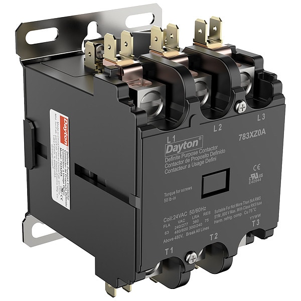 Definite Purpose Magnetic Contactor, LED Lighting Current Rating Not Applicable, Coil Voltage 24V AC, Number of Poles 3, NEMA Enclosure Rating No Enclosure, Tungsten Lighting Current Rating Not Applicable, Fluorescent Lighting Current Rating Not Applicable, Reversing Capability Non-Reversing, Frame Size Not Applicable, Horsepower @ Single Phase - 240V AC 10 hp, Horsepower @ Single Phase - 120V AC 5 hp, Full Load Current - Resistive 75 A, Full Load Current - Inductive 63 A