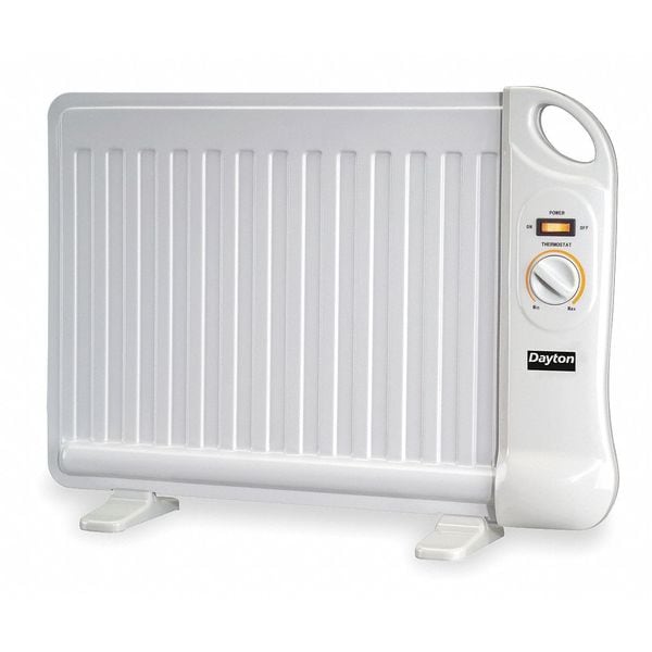 Electric Flat Panel Heater, Non-Oscillating, Number of Heat Settings 1, Heating Method Radiant, NEMA Plug Configuration 5-15P, 1 Phase, Voltage 120, Cord Length 72 in, Manufacturers Warranty Length 1 yr, Includes 3-Prong Grounded Plug, Support Feet, Standards ETL
