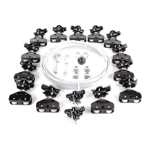 Festoon System Kit, Compatible Cable Type Round, Included Components Clamps, Hardware, Trolleys, Wire Rope Clips, Maximum Track Length 80 ft, Maximum Travel Distance 80 ft, Maximum Trolley Capacity 13 lb, Minimum Cable/Hose Required 98 ft, Minimum Track Length 80 ft, Number of Trolleys Included 13, Storage Length 5.33 ft, Track Type Wire Rope, Trolley Frame Material Plastic, Trolley Wheel Diameter 1.5 in, Trolley Wheel Material Nylon, Minimum Compatible Flat Cable Height Not Applicable