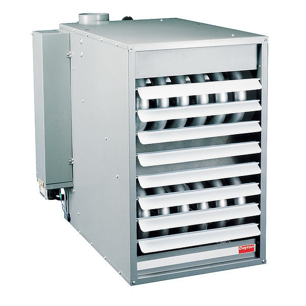 Gas Wall and Ceiling Unit Heater, Gas Type NG, Combustion Type Field Convertible, Fan Type Propeller, BtuH Input 200,000, BtuH Output 162,000, 3,200 cfm Air Flow, 8.0 A Full Load Amps, Gas Connection 1/2 in, Flue Dia. 5 in, O.C. Mounting 30 5/8 in, Height 33 3/4 in, Width 37 1/4 in, Depth 43 1/2 in, Indoor Air Discharge Height 24 1/2 in, Indoor Air Discharge Width 30 3/4 in, Heater Voltage 120 V AC, 60 Hz, Air Temp. Rise 47 Degrees F, Installation Height 8 to 20 ft, Ignition System Direct Spark