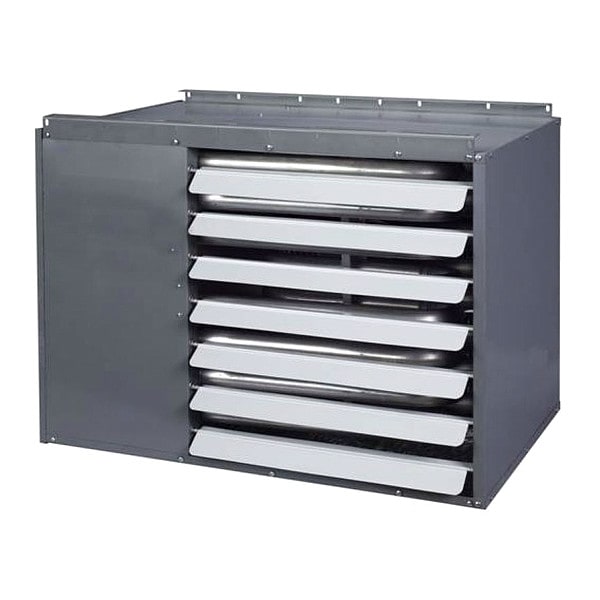 Gas Wall and Ceiling Unit Heater, Gas Type NG/LP, Combustion Type Field Convertible, Fan Type Propeller, BtuH Input 90,000, BtuH Output 72,900, 1,100 cfm Air Flow, 6.4 A Full Load Amps, Gas Connection 1/2 in, Flue Dia. 4 in, O.C. Mounting Adjustable, Height 22 5/8 in, Width 30 in, Depth 26 3/8 in, Indoor Air Discharge Height 22 5/8 in, Indoor Air Discharge Width 30 in, Heater Voltage 115 V AC, 60 Hz, Air Temp. Rise 60 Degrees F, Installation Height 8 ft, Ignition System Direct Spark