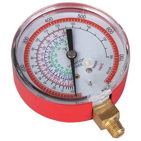 High Side Gauge, Diameter 3 1/8 in, Working Pressure 0 to 800 psi, Connection Size 1/8 in, Color Red, Gauge Type High Side Gauge, For Use With R-22, R-404A, R-407C, R-410A, Application Replacement Manifold Gauge for Manifold Gauge Sets