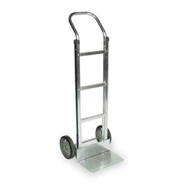 General Purpose Hand Truck, Load Capacity 500 lb, Overall Depth 19 1/2 in, Overall Height 48 in, Overall Width 18 in, Nose Plate Depth 8 1/2 in, Nose Plate Width 14 in, Nose Plate Type Solid Straight, Without Wheel Fenders, Frame Finish Anodizing, Frame Type Flat Back, Handle Type Continuous Frame Flow-Back, Axle-Mounted Wheel Dia. 8 in, Axle-Mounted Wheel Type Tread on Core, Includes Foot Assist Without Foot Assist, Includes Lever Pushoff Without Lever Pushoff