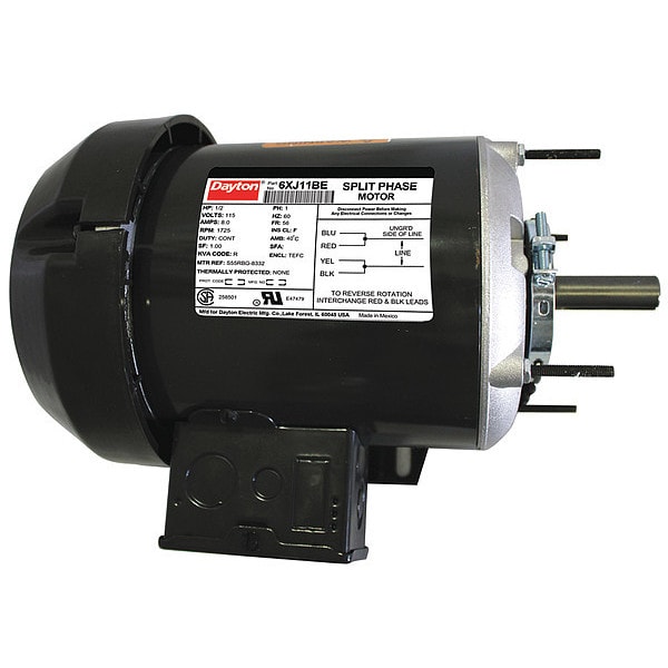 General Purpose Motor, Single Phase, Motor Design Split-Phase, 1/2 hp HP, Nameplate RPM 1,725 RPM, No. of Speeds 1, Voltage 115V AC, Full Load Amps 8.0 A, 56 Frame, Hz 60 Hz, Motor Service Factor 1, Max. Ambient Temp. 40 Degrees C, Motor Thermal Protection None, Duty Cycle Continuous, Ins. Class F, Motor Enclosure Design Totally Enclosed Fan Cooled, Motor Shaft Rotation CW/CCW, Motor Mounting Type Cradle Base, Motor Shaft Design Keyed, Motor Frame Material Steel