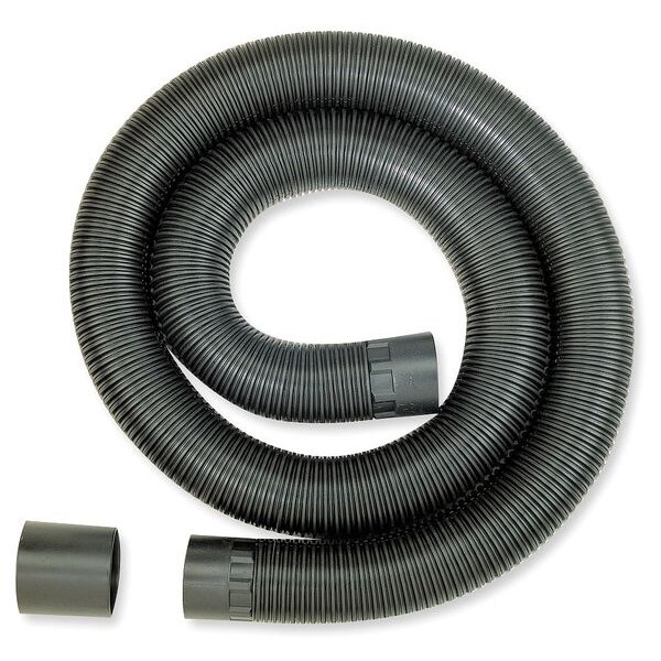 Vacuum Hose, Hose Dia. 2 1/2 in, Hose Length 8 ft, Material Plastic, For Vacuum Type Canister Vacuum, Drum Top Heads, Shop Vacuum, Fits Vacuum Brand Dayton, Fits Vacuum Models 1VHF8, 1VHF9, 22XJ53, 3UP78, 3VE22, 4TB87, 6AKY2, Color Black, Includes (2) Locking Fit Types, (3) Machine/Inlet Hose Ends, Accessory Hose End, Friction Fit