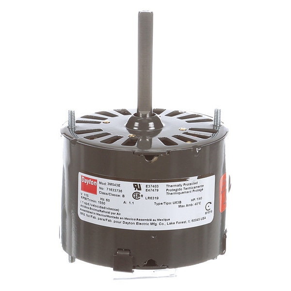 HVAC Motor, Single Phase, Motor Design Shaded Pole, 1/40 hp HP, Nameplate RPM 1,550 RPM, No. of Speeds 1, Voltage 115V AC, 1.1 A Full Load Amps, 3.3 Frame, Output Watts 19 W, 60 Hz Hz, Usable @ 208V Not Usable at 208V, Usable @ 200V Not Usable at 200V, Motor Service Factor 1, Motor Thermal Protection Auto, Ins. Class B, Duty Cycle Continuous, Max. Ambient Temp. 40 Degrees C, Motor Shaft Rotation CWSE, Motor Enclosure Design Open Air Over, Motor Mounting Type Stud, Motor Frame Material Steel