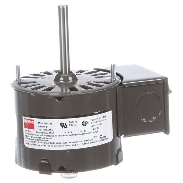 HVAC Motor, Single Phase, Motor Design Shaded Pole, 1/40 hp HP, Nameplate RPM 1,550 RPM, No. of Speeds 1, Voltage 115V AC, 0.97 A Full Load Amps, 3.3 Frame, Output Watts 19 W, 60 Hz Hz, Usable @ 208V Not Usable at 208V, Usable @ 200V Not Usable at 200V, Motor Service Factor 1, Motor Thermal Protection Auto, Ins. Class B, Duty Cycle Continuous, Max. Ambient Temp. 40 Degrees C, Motor Shaft Rotation CWSE, Motor Enclosure Design Open Air Over, Motor Mounting Type Stud, Motor Frame Material Steel