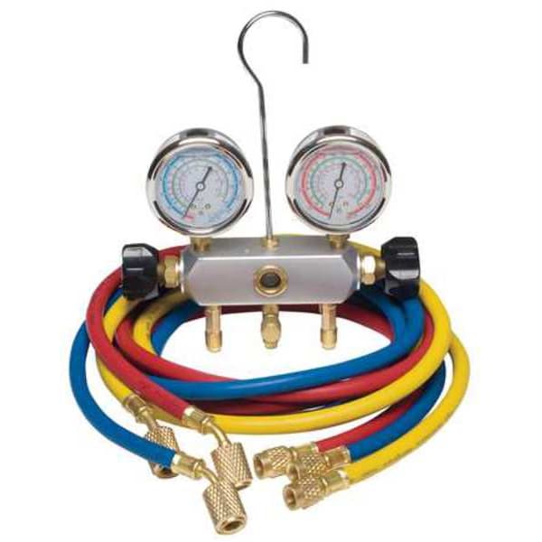 Manifold Gauge Set, Number of Valves 2, Number of Hoses 3, 6 ft, 0 to 500 psi, 30 in Hg to 350 psi, Aluminum, With 2 3/4 in Diameter High and Low Side Oil Filled Gauges, Piston Style Valves, Not Applicable, Includes Blind Ports on Manifold, Hanging Hook