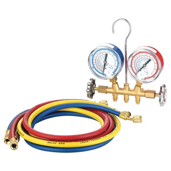 Manifold Gauge Set, Number of Valves 2, R-22, R-404A, R-407C, R-410A, Number of Hoses 3, 6 ft, 30 in Hg to 800 psi, 30 in Hg to 600 psi, Brass, With 3 1/8 in Diameter High and Low Side Dry Gauges, Piston Style Valves, Not Applicable, Includes Blind Ports on Manifold, Hanging Hook