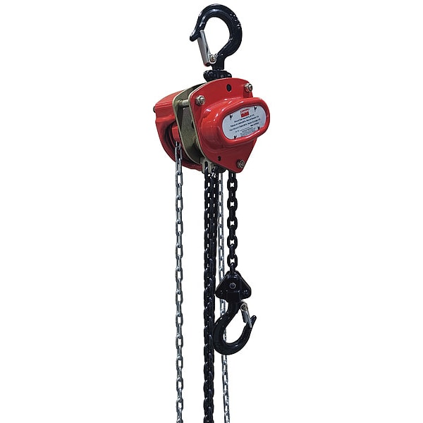 Manual Chain Hoist, Chain Length 10 17/32 ft, For Minimum Beam Flange Width Not Applicable, For Maximum Beam Flange Width Not Applicable, Headroom 10 21/32 in, Includes Brake Brake Included, Lifting Hook Type Hook with Safety Latch, Maximum Lifting Capacity 500 lb, Maximum Lifting Length 10 ft, Mount Type Hook Mounted - No Trolley, Body Depth 4 in, Body Material Steel, Body Width 4 1/16 in, Brake Type Weston Style, Double Disc Brake, Chain Grade Grade 80, Chain Material Alloy Steel, Color Red