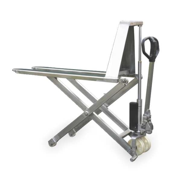 High-Lift Pallet Jack, Load Capacity 2,200 lb, Lift Mechanism Hydraulic, Lift Control Hand Pump, Width Across Forks 27 in, Width Between Forks 15 in, Fork Style Standard, Fork Type Fixed, Scissor Type Supported Base, Maximum Lifting Height 32 in, Frame Material Stainless Steel, Base Inside Width 14 3/8 in, Base Outside Width 27 in, For Pallet Type Open, Fork Length 46 in, Fork Width 6 in, Overall Height 48 in, Overall Length 62 in, Overall Width 27 in
