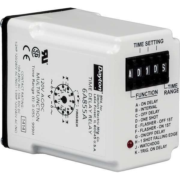 Multi-Function Time Delay Relay, Adjustment Method Push Button, Rotary Knob, Base Shape Octal, Coil Voltage 12V DC, Contact Form DPDT, Contact Rating (AC) 10 A @ 240V, Contact Rating (DC) 10 A @ 30V, Current Rating 10 A, Number of Delay Functions 10, Delay Function Multi Function, Electrical Connection Socket, Flat Pin Width Not Applicable, IP Rating IP20, Input Voltage 12V DC, Minimum Time Setting 0.05 sec, Maximum Time Setting 999 hr, Number of Pins 11, Sealing Enclosed, Mounting Style Plug-In