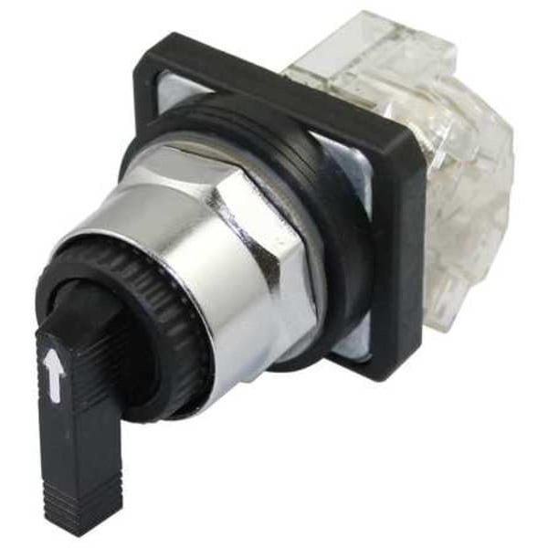 Selector Switch, 30 mm, 3 Position, Momentary/Maintained/Momentary Action, 1NO/1NC Contact Form, Type of Operator Extended Lever, Color Black, No Key Key Removal, Operator Head Material Plastic, Basic Material Metal, Bezel Material Zinc, Bezel Color Silver, Contact Rating 10A @ 600V AC, 2.5A @ 600DC, NEMA Contact Rating Designation A600/Q600, NEMA Rating 13, 4, IP Rating IP65, Cam C, Switch Operation @ Position A XO, Switch Operation @ Position B OO, Switch Operation @ Position C OX