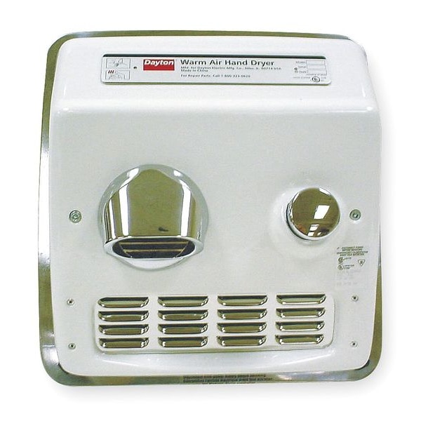 Hand Dryer, Dry Time 25 sec, Cover Material Cast Iron, Color White, ADA Compliant Yes, Sound Level 70, Voltage 115, Dryer Activation Push Button, Finish Porcelain Enamel, Standards ADA Compliant,cULus, Includes Cover Removal Tool, Air Flow Rate 200 cfm, Overall Depth 4 in, Overall Height 13 7/8 in