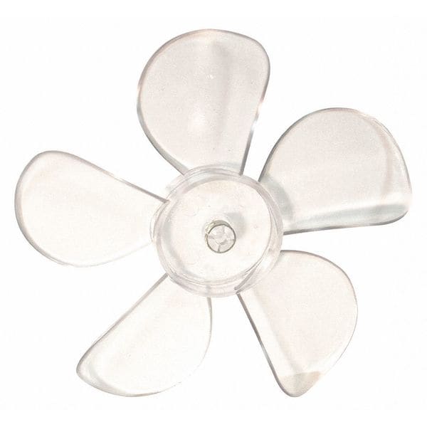 Propeller, 155 cfm CFM @ 3000 RPM, Propeller Dia. (In.) 5 9/16 in, Number of Blades 5, Bore Dia. (In.) 3/16 in, CCW Facing Discharge Rotation, Recommended Motor HP 1/100 hp, Propeller Material Plastic, Color Clear, Max. Ambient Temp. (F) 200 Degrees F, Attaches Press Fit on Motor Shaft, OEM (Replacement) -, OEM Part Number -