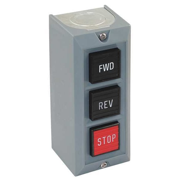 Control Station, Number of Operators 3, Number of Pilot Lights 0, Size 25 mm, Legend Forward/Reverse/Stop, Type of Operator Push Button/Push Button/Push Button, Action Momentary/Momentary/Momentary, Operator Color (2) Black, Red, Contact Form 2NO/3NC, Mechanical Interlock No, NEMA Rating 1, Contact Rating 10A @ 600V AC, 5A @ 24V DC, NEMA Contact Rating Designation A600/P600, IP Rating IP40, Mounting Wall, Hub 1/2 in to 3/4 in NPT, Height 2.19 in, Width 3.69 in, Depth 2.06 in