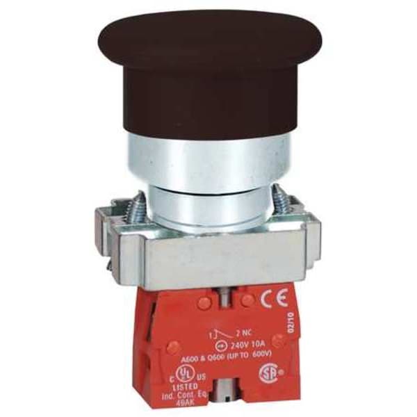 Mushroom Head Push Button, 22 mm, Momentary Action, 40mm Mushroom Head Type of Operator, Head Material Metal, Contact Form 1NO, Bezel Chrome Die Cast Aluminum, Color Black, Contact Rating 10A @ 600V AC, NEMA Contact Rating Designation A600/Q600, Number of Operators 1, NEMA Rating 1, 12, 13, 2, 3, 4, 4X, Legend No Legend, Standards CE, CSA, IEC, UL Listed, Terminal Connection Pressure Plate, Material Metal