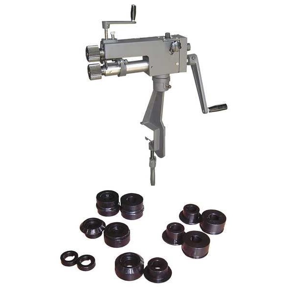 Rotary Machine, Sheet Capacity Aluminum 17 ga, Sheet Metal Capacity Mild Steel 22 ga, Sheet Metal Capacity Stainless Steel 28 ga, Throat Depth 6 in, Adjustable Depth Stop Yes, Included Roller Dies (6) Die Sets: Large and Small Turning, Burring, Wiring, Ogee Beading, and Crimping, Actuation Hand Crank, Application Clamps to Workbench, Operates Clockwise and Counter Clockwise, Color Gray