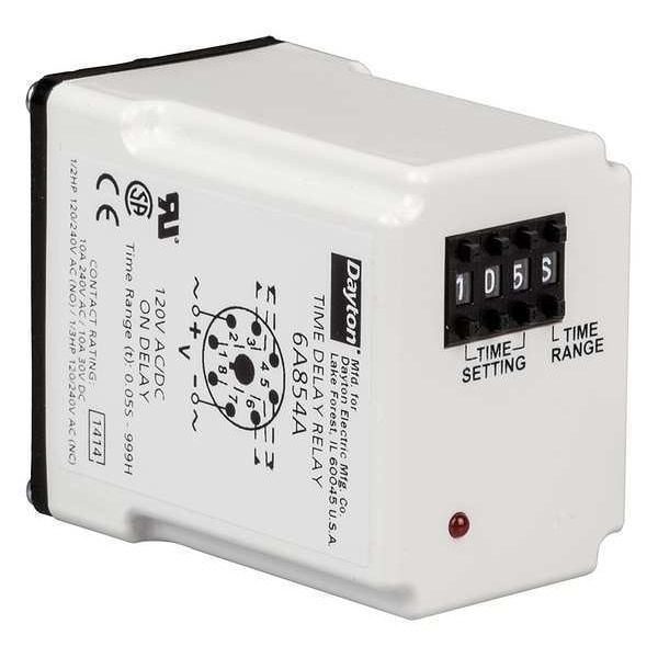Single Function Time Delay Relay, Adjustment Method Push Button, Rotary Knob, Base Shape Octal, Coil Voltage 120V AC/DC, Contact Form DPDT, Contact Rating (AC) 10 A @ 240V, Contact Rating (DC) 10 A @ 30V, Current Rating 10 A, Number of Delay Functions 1, Delay Function On Delay, Electrical Connection Socket, Flat Pin Width Not Applicable, IP Rating IP20, Input Voltage 120V AC/DC, Minimum Time Setting 0.05 sec, Maximum Time Setting 999 hr, Number of Pins 8, Sealing Enclosed